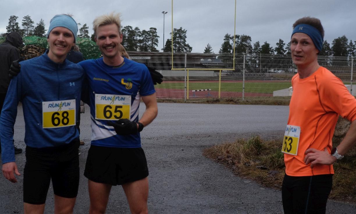 Hurjinta oli vauhti miesten yleisessä sarjassa, peräti neljän juoksijan alittaessa 33 minuutin ajan. Aikoihin siivittävät paitsi keli ja kunto, varmasti myös veto- ja kiriapu mitä miehet toisistaan saivat. Puolimatkan käännössä letka oli vielä tiiviisti yhdessä, viiden juoksijan kokoisena. Maaliin ehtivät ensimmäisinä veljekset Artturi ja Severi Salonen, jotka eivät tosin lopussa toisistaan kiriapuja ottaneet, vaan ylittivät maalilinjan sopuisasti rinta rinnan ajassa 32.43. Karkkilan poikien Jukka Salo oli matkalla taipunut veljeksistä yhdentoista sekunnin päähän ja Ikaalisten Nousevan Voiman Joona Huila sortteerattiin tässä kisassa neljänneksi ajalla 32.57.