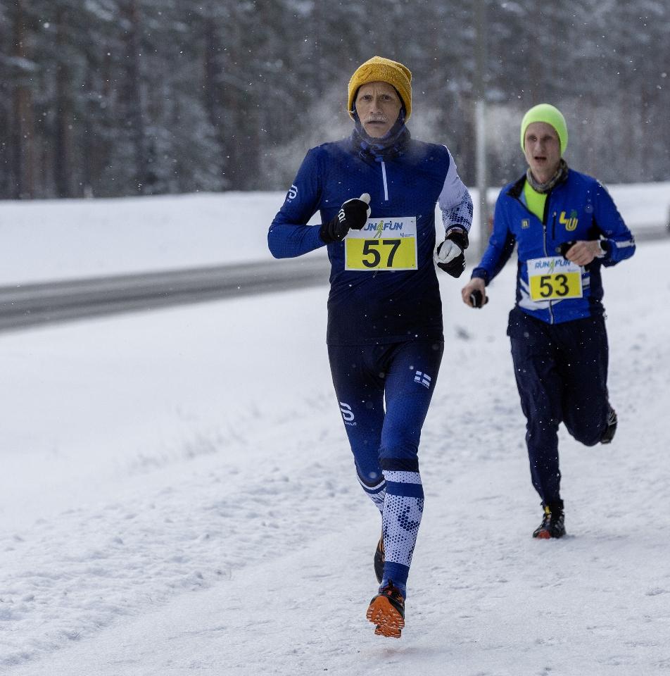 Jos aiemmissa osakilpailuissa on nautittu kovista vauhdeista ja juostu shortseissakin, niin nyt oli vuorossa kunnon talvijuoksua. Yön aikana oli satanut kevyt huntu "enkelin höyheniä" ja ajoittain taivaalta ilmaantui jotakin lähes häviävää kisan aikanakin. Tien kunnossapitäjä höyläsi väylän puoli yhdentoista aikaan - baanalle jäi tasainen, pakkautunut lumi- ja jääpeite - tasaisen pitävä tai liukas kauttaaltaan, katsantokannasta riippuen. Monet juoksivat normilenkkareilla, ilmankosteus ja tuulenviri toivat vajaan kymmenen asteen pakkasen raikkaasti iholle.
